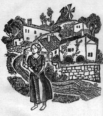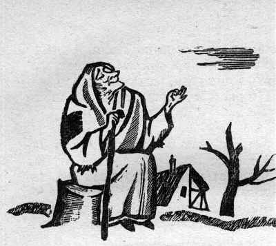 Избушка на краю деревни. Дверь ниже уровня земли. Дверь качнулась на кожаных петлях. По сту­пенькам поднимается, ступила на землю, заслонила глаза, ладонью, смотрит на восходящее солнце старая женщина. На ней платье из домотканой холстины, усеянное яркими заплатами, хотя некоторые уже ус­пели выгореть. У нее маленькое, сморщенное, круг­лое лицо. Она открывает беззубый рот. Сейчас она за­говорит.