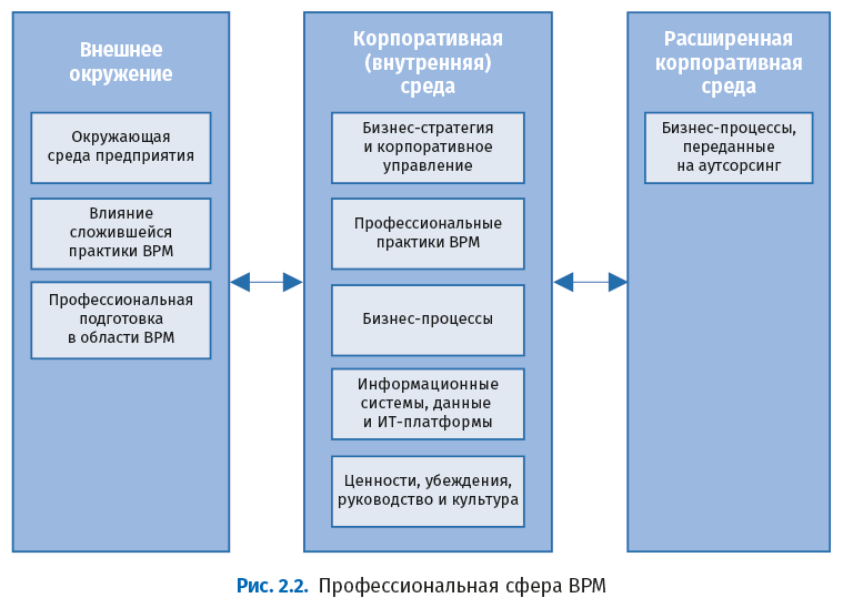 Корпоративная (внутренняя) среда: средний прямоугольник на рис. 2.2 содержит пять элементов, внутренних с точки зрения предприятия: стратегия и корпоративное управление; профессиональная практика BPM; бизнес-процессы; информационные системы, данные и ИТ-платформы; ценности, убеждения, руководство и культура. Бизнес-стратегия и корпоративное управление направляют организацию. Профессиональная практика BPM – это управление бизнес-процессами организации (процессное управление). Бизнес-процессы – это формализованные операционные регламенты организации, как внутренние, так и внешние. Информационные системы, данные и ИТ-платформы – это технологии, обеспечивающие бизнес-процессы. Ценности, убеждения, лидерство и культура – это уникальные для каждой организации факторы, определяющие поведение сотрудников