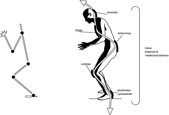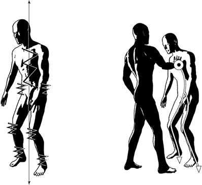 Упражнение можно выполнять как в паре, так и самостоятельно. Принять позу «Кучер», попросить партнера произвести толчок в грудь по направлению к Земле. Постараться ощутить «внутреннюю пружину» вокруг позвоночника и суставов, за счет этой упругости войти в колебания маятника «Пружина». Далее самостоятельно прорабатывать различные частоты и амплитуды колебаний (рис. 27).
