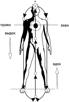 На изображении видны: два плечевых окна, направленных вверх под углом 45°, два окна подмышечных сплетений, направленных в горизонтальной плоскости; два окна, соответствующих тазобедренным суставам, направленных под углом 45° вниз и, наконец, два мощнейших окна, соответствующих Роднику и Истоку. Направления дыхания: на расширении через окна в пространство, на сжатии в точку – центр Яра.