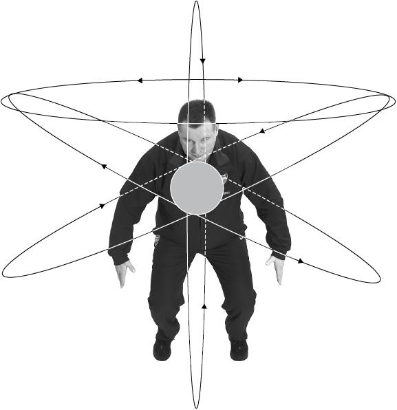 Итак. Технология выставления «Колец» по внешней границе Ведогона та же, что и для упражнений 1 и 2. Но! «Колец Силы» будет всего четыре и радиусом они будут от 3 м и более. Это будут: самое большое вертикальное «Кольцо», расположенное по центральной оси; одно горизонтальное «Кольцо» на уровне Яра и два диагональных «Кольца». Не правда ли, знакомая схемка? Точь-в-точь повторяет схему ядра атома с траекториями вращающихся вокруг него частиц (фото 161).