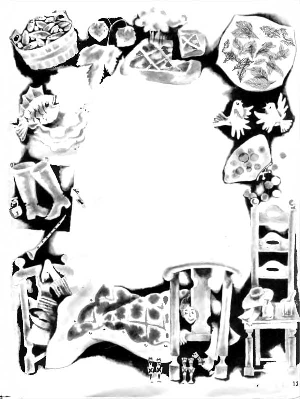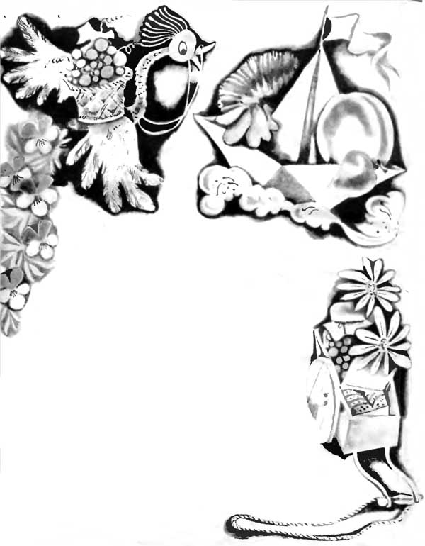 — Гроздь винограда, — сказала Сюзи.— Персик, — сказала Элен.— А мне бы печенья да ложку варенья, —Со вздохом сказала Джен.— Анютины глазки, — сказала Сюзи.— Пионы, — сказала Элен.— А мне бы в кармашек букетик ромашек, —Со вздохом сказала Джен.— Огромные крылья, — сказала Сюзи.— Корабль, — сказала Элен.— А мне бы без спешки поездить в тележке. —Со вздохом сказала Джен.