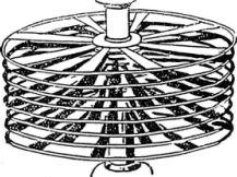 магнетизм, то то же самое вещество будет, вероятно, предохранять и от тяготения, — рассуждал я.Вы знаете, что я нашел сотни новых химических соединений, смесей, и даже новые элементы. Среди них был новый металл, легче воздуха, который я назвал «радалюминием», ибо в состав его входят радий и алюминий. Я выработал только один грамм этого металла и был поражен его легкостью, ибо он поднялся вверх в реторте, а когда я вынул его, он взлетел к потолку лаборатории. Тогда я всецело занялся выработкой этого металла в больших размерах. К счастью, я осторожно проводил свои первые опыты, иначе я не мог бы сейчас беседовать здесь с вами, ибо шарик нового металла взлетел вверх, проломил стекло реторты и, выстрелив, как пуля, пробил потолок и исчез в небе. После этого я стал осторожнее. Я убедился, что следует вырабатывать этот металл небольшими частями и затем соединять эти части вместе с соответствующими предосторожностями. Я не буду надоедать вам подробным описанием моих опытов. Достаточно сказать, что в конце концов я нашел следующую наилучшую форму для щита против тяготения: ряд тонких листов в виде колес с большими промежутками между спицами, как это видно на рисунке.