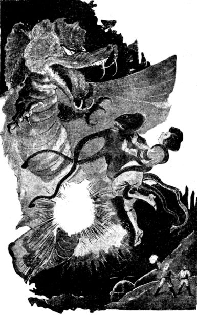 У наездника не было оружия, но он схватил пресмыкающееся двумя щупальцами и пустил свой электрический ток. Удар был, вероятно, ужасен, потому что чудовище сделало дикий скачок и замерло без движений — совершенно парализованное.