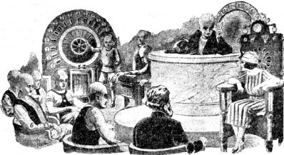 С этими словами он нажал кнопку, и в комнату, без посторонней помощи, вошло странное кресло, двигаемое, очевидно, каким-нибудь невидимым механизмом. К креслу были прикреплены всевозможные термометры и циферблаты.