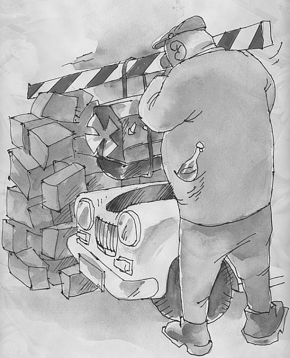 Часам к девяти утра вся вчерашняя команда была в сборе. Для начала Григорич потребовал у нас десять долларов, и все «позавтракали», после чего началось коллективное обсуждение проблемы рычага. Галдеж стоял невыносимый. Внезапно плотник, остававшийся все время трезвым (нам потом рассказали, что он закодировался, так как по пьяному делу недавно сжег свою мастерскую, да и сам едва не погиб в огне), вскочил, что-то сказал Григоричу, на что тот отреагировал возгласом «Точно!», и все куда-то убежали. Прошло около получаса. Где-то в глубине сознания у меня начала созревать мысль о том, что нас вместе с нашими проблемами бросили на произвол судьбы. Но минут через сорок послышались топот, шум и крики. Это возвращалась наша бригада, тащившая длинную металлическую трубу, раскрашенную, подобно зебре, белыми и черными полосами. Как мы потом узнали, неподалеку находился железнодорожный переезд, на котором железнодорожники, вместо украденного кем-то шлагбаума, приспособили эту самую трубу. Ее-то бригада и притащила. Гордый своей находчивостью, плотник организовал водружение трубы на пирамиду из камня. Затем к концу трубы прикрепили тросом двигатель.