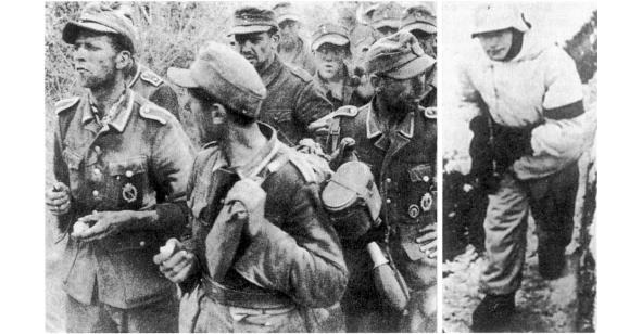 длинные, из искусственной шерсти. На уши офицеров одевались тёплые наушники, а у солдат на пилотку одевались матерчатые «кольца» с «макушки под бороду». Но всё равно мерзли они страшно.Но за лето 1942 года Германия сумела изготовить своим войскам зимнюю одежду в большом количестве – очень продуманную и удобную. Широкие брюки на лямках, в которые солдат ЗАЛЕЗАЛ ПРЯМО В ШИНЕЛИ. Поверх брюк – куртка без воротника на шнурках у шеи и пояса. На голову – шлем с раскрылками внизу как у нашего сварщика. Раскрылки заправлялись под верхний шнурок куртки. Одна сторона одежды была серого цвета, другая – белого, для полевых условий. Обувь – войлочные бурки на кожаной подошве.