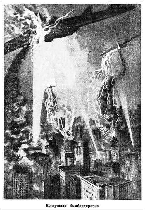 аппаратом выбрасывает густые газовые облака, скрывающие как самый самолет, так и выбранное им направление.Всюду идет лихорадочная постройка воздушных машин. Франция располагает более 6.000 аэропланов последних конструкций и особенно гордится своими ночными бомбовозами, из которых составляются целые эскадрильи, главным образом, для сбрасывания удушливых и зажигательных бомб. Англичане во время свой недавней войны в Ираке успешно воспользовались своим воздушным флотом в качестве транспортного средства; а теперь дело дошло до того, что 400 самолетов могут перевезти решительно все вооружение для целой дивизии пехоты. Самолеты-разведчики развивают ныне скорость до 500 км в час. Но всего этого мало и поставлена новая техническая задача: освободить самолеты как от громоздких двигателей, связанных с потреблением горючего, так и от самих управляющих ими летчиков. Самолет должен управляться издали, т. е. на расстоянии, с помощью радиоволн. Тогда будет происходить сражение двух воздушных флотов, которые лишены экипажей и послушно выполняют все приказы, которые передаются им на расстоянии нескольких сот километров.