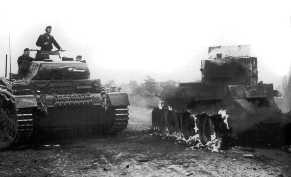 Немецкий танк Pz III проезжает мимо горящего «БТ-5»