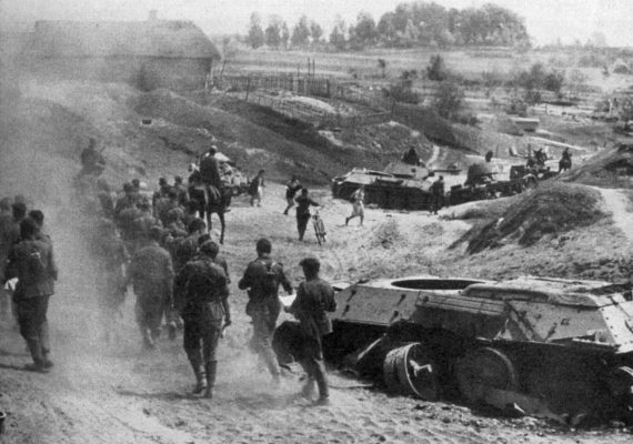 Немецкие солдаты проходят мимо уничтоженной внутренним взрывом «тридцатьчетверки». На заднем плане видны брошенные «Т-34» и «Т-26»