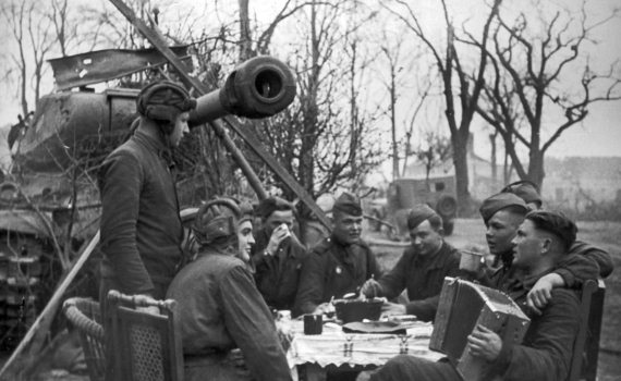 Последние дни войны. Экипаж «ИС-2» позаимствовал где-то в домах стол и стулья и отдыхает с комфортом.