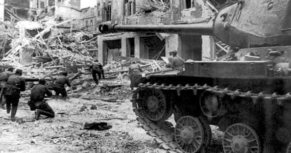 «ИС-2» на улицах Берлина. Во время уличных боев танк становился ядром штурмовой группы. Апрель 1945 года