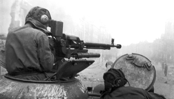Командир танка «ИС-2» ведет огонь из зенитного пулемета ДШК. Однако мирно стоящие на заднем фоне люди заставляют признать фотографию постановочной