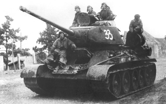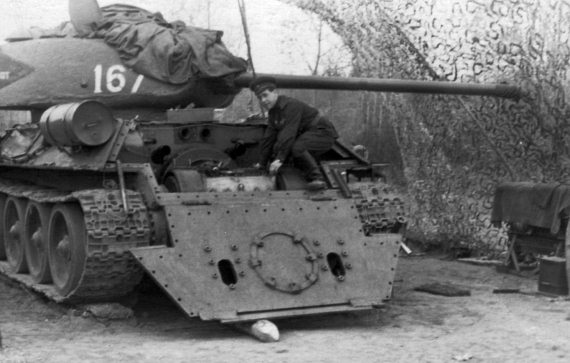 «T-34-85» на дорогах Германии. Слева от люка механика-водителя на шаровой установке пулемета, судя по биноклю, сидит командир танка