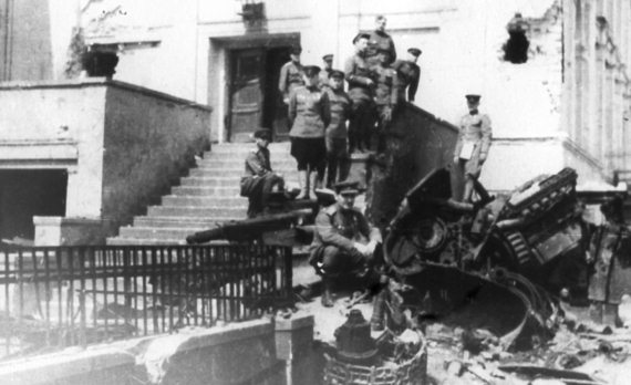 Офицеры фотографируются. Рядом остатки уничтоженной внутренним взрывом «тридцатьчетверки»