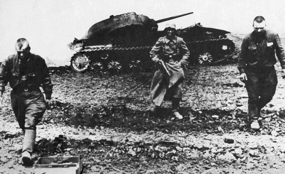 Немецкий солдат конвоирует захваченных в плен советских бойцов на фоне уничтоженного внутренним взрывом «КВ-1»