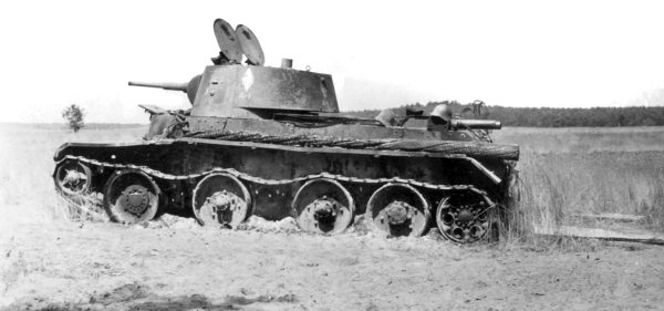 Сгоревший в атаке на г. Немиров танк «БТ-7М» из состава 1-го взвода 1-й роты 1 батальона 53-го тп 81-й мд. НА МТО танка видны 3 каски СШ-36: танки этого полка имели посадочным десантом стрелковую роту. 24.06.41 года