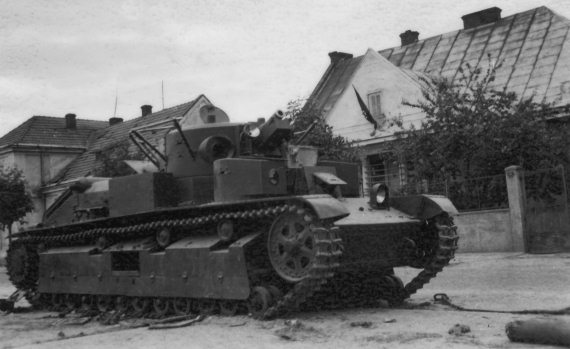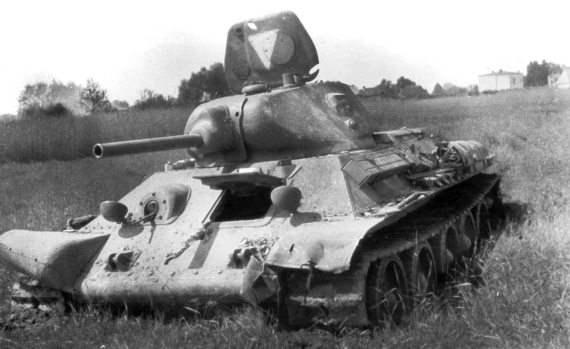 Танк «Т-34» из состава 15-го тп 8-й тд 4 мк, оставленный экипажем после атаки на г. Немиров 24.06.41 года. На башенном люке белый треугольник – ЗВО танков 8-й тд в этот период.