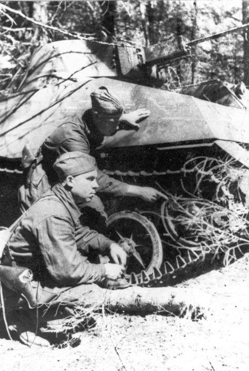 Выйдя из боя, экипаж прежде всего должен был обслужить машину: заправить ее горючим и боеприпасами, проверить механизмы, почистить и, если надо, вырыть для нее капонир и замаскировать. В этой работе принимал участие весь экипаж, иначе танкисты просто не управились бы. Командир иногда устранялся от наиболее грязной и примитивной работы – чистки ствола или отмывки снарядов от смазки. «Снаряды я не мыл. Но ящики подносил», - вспоминает А.С. Бурцев. Зато капониры для танка или «землянку» под ним рыли всегда сообща.