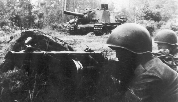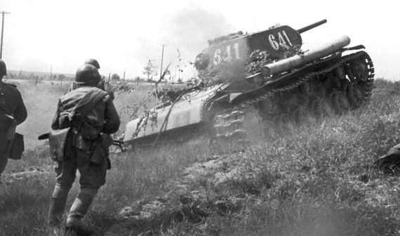 Атака «КВ-1» при поддержке пехоты. Спиной к нам, видимо, командир взвода, вооруженный автоматом «ППС» и пистолетом. Через плечо у него перекинута плащпалатка в скатке. 1944 год, 26-я армия
