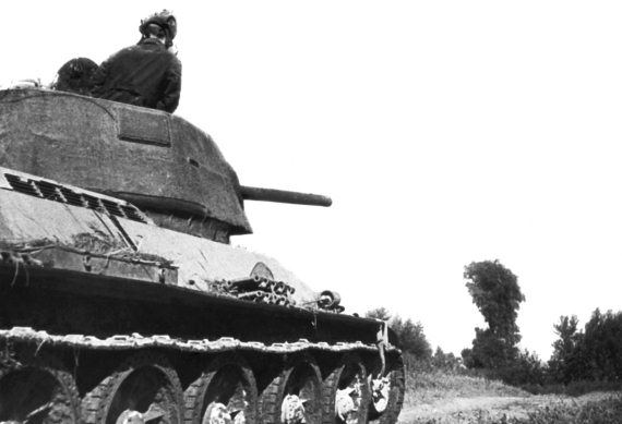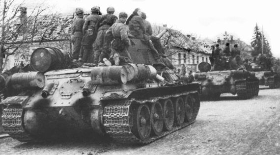 «Т-34» на марше. Помимо дополнительных топливных баков к танкам привязаны 200-литровые бочки с горючим