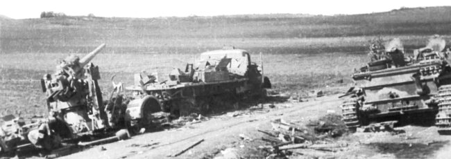 Все то, что необходимо знать, чтобы успешно воевать. Получив разведданные, грамотный командир по названию части противника должен определить, каким оружием враг встретит его, как с ним бороться успешно и с минимальными потерями. Но это было потом. А пока мы пришли к Дубно и встали в оборону перед городом. Небольшой городишко. Горит. Немцы выходят из Дубно колоннами, пока не замечая нас. А наши командиры, вместо того чтобы максимально подготовиться к встрече противника, решили покончить с врагом лихим кавалерийским наскоком: «Ура! За Родину! За Сталина!» Взревели моторы, и полк помчался в атаку. Здорово мы погорели там. Немцы остановились, на наших глазах быстро развернули артиллерию и как дали нам прикурить! Расстреливали, как в тире. Штук семьдесят этой мелюзги, легких танков «Т-26» и «БТ», участвовало в атаке, а осталось около двадцати. «Т-26»