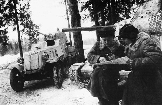 Танки БТ-7 и Т-34 в засаде. 1-я гвардейская танковая бригада. Западный фронт, ноябрь 1941 года.