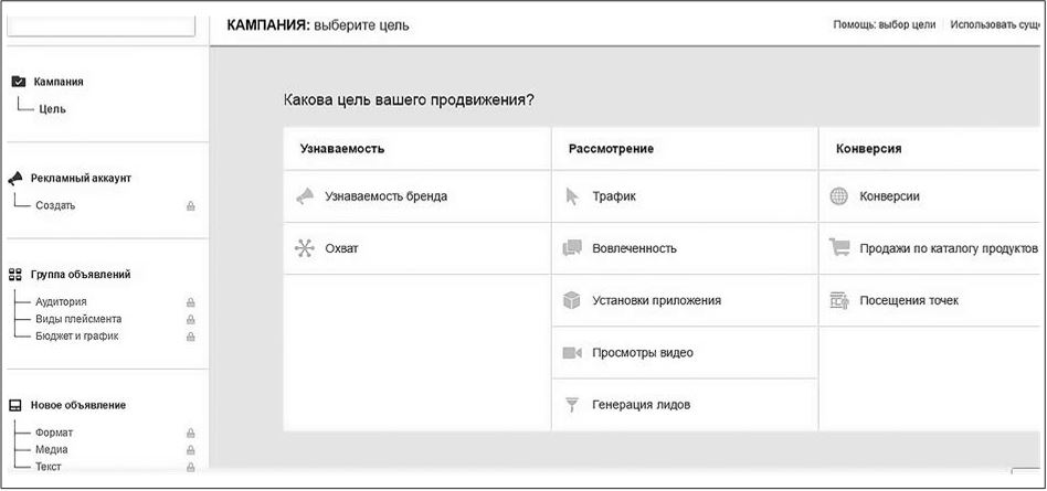 2. Дождаться загрузки страницы, а затем выбрать цель рекламы (рис. 1.3) (об этом мы поговорим немного дальше, поэтому либо пролистайте до с. 26, либо выбирайте любую цель и настраивайте фейковую рекламу, просто чтобы открыть Ads Manager).