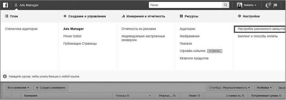 1. Войдите в менеджер рекламы и найдите кнопку «Настройки рекламного аккаунта» (рис. 1.11).