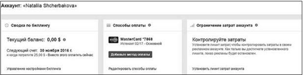 Когда вы создаете рекламный аккаунт, система проверяет доступность денег на вашей карте и, если все хорошо, открывает для аккаунта кредитный лимит в размере $25. Когда вы запускаете рекламу, вы тратите виртуальные деньги. А реальные у вас списываются в ту дату, которая указана в блоке «Сводка по биллингу» (как правило, это 30–31-е число каждого месяца) (рис. 1.13).
