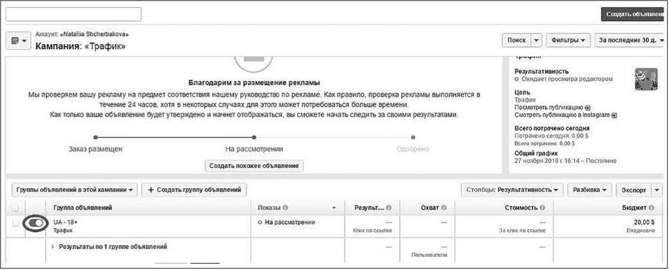 7. Нажимайте кнопку «Далее», и, если у Facebook нет вопросов к этой рекламе, она будет размещена и отправится на модерацию (если вопросы есть – а к разным рекламным форматам они будут разные, – сделайте то, что просит система, и еще раз отправьте рекламу на размещение).