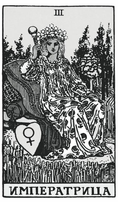 Величавая фигура, богато одетая и сидящая с царственным видом дочери Неба и Земли. В ее диадеме двенадцать звезд, собранных в гроздь. На щите, прислоненном [к креслу] сбоку, – символ Венеры. Перед нею созревающая нива, а за нею – водопад. Скипетр в ее руке увенчан шаром [как символом] этого мира. Она есть низший Сад Едемский, Земной Рай, все, что символизируется зримым домом человека. Она не Regina coeli [10] , но все же refugium peccatorum [11] , благодатная Матерь многих тысяч. В некоторых аспектах ее правильно описывали как желание [12] и крылья его [13] ; как жену, облеченную в солнце [14] ; как Gloria Mundi [15] , как завесу Sanctum Sanctorum [16] ; но могу добавить, что это не душа, обретшая крылья, если только весь символизм не истолковать иным, необычным образом. Она прежде всего – всеобщая плодовитость и внешний смысл Слова. Это очевидно, ибо не было дано человеку более прямого послания, чем то, что рождается женщиной; однако сама она не несет его истолкования. В иной системе понятий карта Императрицы означает дверь или врата, через которые открывается вход в эту жизнь, как в Сад Венеры. Тот же путь, что выводит отсюда в потустороннее, есть тайна, ведомая Верховной Жрице и сообщаемая ею лишь избранным. Большинство старых соотнесений этой карты символически совершенно неправильно – как, например, отождествление ее со Словом, Божественной Природой, Триадой [17] и так далее.