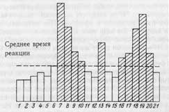 Эти реакции не контролируются волей, и поэтому всегда истинны. Результаты теста можно четко проиллюстрировать диаграммой (рис. 5). Высота колонок отражает время реакции на каждое слово. Штриховая горизонтальная линия показывает среднее время реакции. Белые колонки обозначают реакции без нарушений, а заштрихованные – нарушенные реакции, время которых превышает среднее. В реакциях 7-10 мы наблюдаем целую серию нарушений. Реакция 13 изолирована, но вслед за ней идет еще одна серия нарушений (16-20).