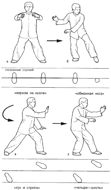 Движения ног можно разделить на грубые и изящные. В приведенном примере к грубым движениям следует отнести переход из «стойки тай-цзи» в левостороннюю стойку «лук и стрела». Изящными движениями можно считать поворот корпуса влево, определяющий движения всего тела, едва заметное отклонение корпуса назад, скользящее движение левой ноги в переднюю позицию, перенос веса тела при повороте колен, утверждение позиции задней ноги и установление центра тяжести в области дан тьян (живота). Понимание сущности изящных движений необходимо для обретения надежного равновесия и достижения спиральной силы, которая образуется от пятки задней ноги.