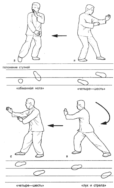 Перенесите вес тела на заднюю (левую) ногу, немного отведите назад правую так, чтобы ее пальцы слегка касались пола; тем самым на какой-то момент вы будете в позиции «стойки обманной ноги», «перемещая шарик ци» (рис. 5.5, б). Сделайте правой «видимой» ногой шаг вперед примерно на 75 см и встаньте в стойку «лук и стрела»; одновременно поднимите правую руку на уровень глаз, а ладонь левой расположите под локтем правой, как показано на рис. 5.5, в, что соответствует технике отражения (пень). В этот момент вес тела равномерно распределен на обе ноги, а центр тяжести находится в дан тьян. Положения ступней показаны на рис. 5.6.
