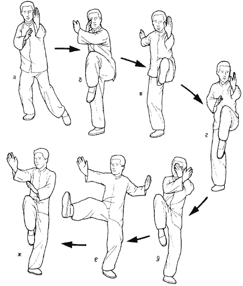 рука обозначает прямой удар, а правая ладонь расположена на уровне правого колена.Не останавливаясь, переместите вес тела на правую ногу, затем — на левую и поставьте правую ногу примерно на 30 см назад, занимая правостороннюю стойку «четыре — шесть». Одновременно руки занимают позицию, показанную на рис. 5.3, г. Центр тяжести расположен в дан тьян.