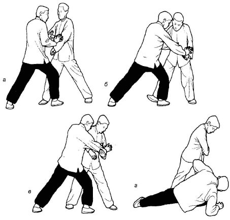 Удар плечом является одним из примеров применения техники као, или протягивания. Другим примером может служить случай, когда противник захватил обе руки и старается отбросить вас назад (рис. 5.10, а). Не меняя положения ног, «поглотите» его силу, сместив область солнечного сплетения назад (рис. 5.10, б). Как только тело оппонента приблизится к вашему плечу (рис. 5.10, в), поверните корпус и разверните левую ногу назад против часовой стрелки, заваливая противника своим плечом (рис. 5.10, г). Снова обращаю ваше внимание на то, что ударная сила идет не от плеча, а от ноги, через пояс.