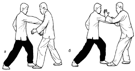 Приведу один пример применения као в реальном бою. Предположим, противник атакует прямым ударом кулака — самым распространенным приемом во многих боевых единоборствах (рис. 5.11, а). «Поглотите» его ударную силу, встав в позу «четыре — шесть», правой рукой толкайте его предплечье, а левой ладонью одновременно атакуйте локтевой сгиб оппонента приемом «игра на лютне» (рис. 5.11, б). В реальном поединке этим приемом ломается рука противника, так что при отработке этой техники с партнером соблюдайте особую осторожность.