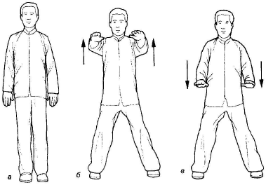 Встаньте в стойку «бесконечного предела» и оставайтесь в полной неподвижности в течение нескольких секунд (или минут, если вы намерены тренироваться долго), как показано на рис. 6.1, а. Сделайте шаг в сторону и перейдите в стойку «верхом на козле». Плавно вдыхая носом, поднимите прямые руки перед собой на уровень груди (рис. 6.1, б). Выдыхая ртом, медленно опустите руки, представляя, что упираетесь ладонями в поверхность воды (рис. 6.1, в).