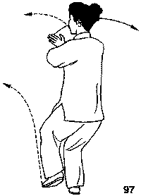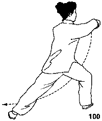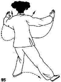 1. Максимально разверните наружу носок левой стопы вокруг пятки, как вокруг оси, дугообразно согните левую ногу в колене, носок правой стопы максимально разверните вовнутрь, вокруг пятки, как вокруг оси, постепенно выпрямите правую ногу. Перенесите центр тяжести вперед, туловище разверните немного влево и поднимите вперед. Таким образом выполняется переходный дугообразный шаг.