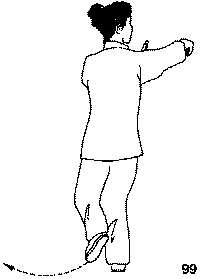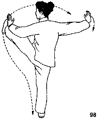 1. Перенесите полностью центр тяжести на правую ногу, слегка согните ногу в колене. Сгибая левую ногу в колене, поднимите ее вверх, носок свободно опустите.