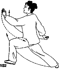 1. Левой стопой, которая за счет подтягивания носка принимает форму крюка, медленно выполните нажатие влево-вперед (отклонение к северу от западного направления составляет 30°). Выпрямите левую ногу, энергию направляйте в пятку.