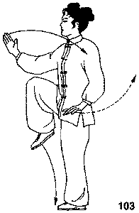 которой выполняли толчок, затем поверните туловище вправо, правой кистью образуйте «крюк» и верните левую руку, согнув ее в локте. При этом обратите внимание на следующее: сгибая левую ногу в колене, удерживайте ее поднятой на том же уровне, стопу направьте вниз в положение около внутренней стороны правой голени (но не ставьте на поверхность), выполняйте полный поворот туловища вправо, взгляд переводите за левой рукой вправо-назад на правую кисть, собранную в «крюк». Правая кисть отводится на 45° к востоку от северного направления, а угол между направлением вперед, в котором выполняется выпад, и правой рукой должен составить 135°.Во 2-м движении одновременно с приседанием на правой ноге опустите левую ногу вдоль внутренней стороны правой ноги и из положения возле правой пятки выпрямите влево и немного назад (чтобы добиться соответствующей поперечной величины шага). Выпрямляйте и опускайте на поверхность левую ногу внутренней стороной передней части стопы; только при условии такого легкого касания ногой поверхности выполняется выпад влево. Слегка касаясь поверхности, максимально разворачивайте вовнутрь левую стопу и постепенно опустите всей площадью на поверхность. При этом обратите внимание на следующее: нельзя поворачивать туловище влево, положение бедер и поясницы естественно и свободно, взгляд по-прежнему направлен вправо назад на правую руку. Левая рука из положения перед правым плечом по дуге опускается в положение перед правой частью грудной клетки.