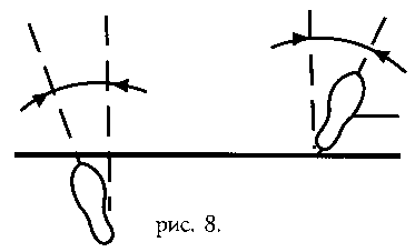 Рис.8. Правильное направление стоп и поперечное расстояние между ногами при выполнении выпада влево во втором движении «Приседание и выпад» 16 формы «Выпад влево и стойка на одной ноге». Передняя часть стопы левой ноги и пятка правой ноги должны быть расположены на одной прямой.