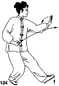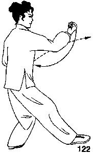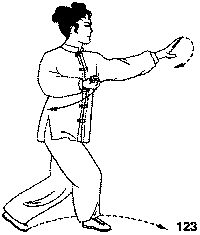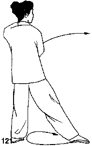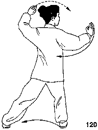 3. Аналогично формам «Поглаживание гривы дикой лошади» и «Охват колена и „упрямый“ шаг», поворот туловища в данной форме должен быть скоординирован с выполнением дугообразного шага, толчковым и поддерживающим движениями рук. Когда вы не поворачиваете туловище или поворот очень медленный, а шаг, толчок и поддержка выполняются слишком быстро, обязательно возникает такая ошибка, как искривление бедра. Когда же, наоборот, туловище повернуто слишком быстро, а шаг, толчок и поддержка осуществляются медленно, возникает такая ошибка – толчок и поддержка не сочетаются с вращением поясницы, нет цельности в применении силы. Выполняя незначительный поворот туловища влево, необходимо, вслед за незначительным перемещением плеча вперед, чуть-чуть наклонить вперед и само туловище. Поворот не должен быть слишком большим, только, чтобы туловище было направлено прямо (в четко западном направлении).