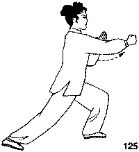 • не выдерживают правильного расстояния поперечного шага между ногами, то есть правая нога смещена влево и расположена напротив левой ноги, тогда как пятку правой ноги надо опускать так, чтобы ширина шага не превышала расстояние от пятки левой ноги до основания ее стопы (10-20 см). Если выполняя 1-е движение, вы недостаточно развернете вовнутрь левую стопу, то место, в которое опускается правая нога, будет смещено слишком влево и, как следствие, невозможно обеспечить свободное положение туловища при перемещении кулака вперед; к тому же, если две ноги будут расположены напротив друг друга, возникнут трудности при выполнении шага в ходе последующей «задержки». Если же пятка правой ноги смещена слишком вправо, это приведет к тому, что бедра будут развернуты с усилием, возникнет напряжение туловища, нарушится равновесие;