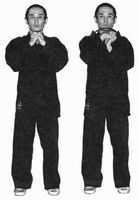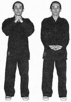 1. Примите исходное положение: туловище естественно выпрямлено, плечи опущены и расслаблены, стопы расположены на ширине плеч и параллельны, руки согнуты в локтях на уровне груди, кисти рук переплетены между собой и образуют замок, голова естественно приподнята, взгляд направлен вперед.