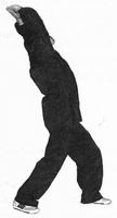 Из исходного положения, разворачивая туловище вправо, сделайте шаг вперед правой ногой и выполните выпад. Поднимите руки вверх, наклоните голову назад, взгляд направлен на руки, прогнитесь в пояснице. Выполните два пружинящих наклона назад. Вернитесь в исходное положение. То же выполните в другую сторону.