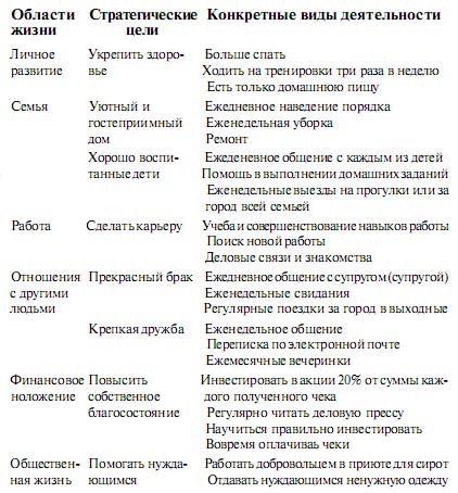 независимым человеком). Однако те способы, с помощью которых вы стремитесь достичь ваших стратегических целей, будут регулярно меняться. Вы будете менять выбранные вами конкретные виды деятельности год от года по мере достижения вами промежуточных целей и добавлять к ним другие виды деятельности. Для вас может быть вполне естественным пересматривать все, что вы делаете, в определенное время года — в январе, с начала нового года; в сентябре, когда вы возвращаетесь к настроению «снова в школу»; или, если вы живете в условиях холодного климата, — весной, когда возвращаются тепло и солнечный свет и заряжают вас энергией для новых проектов.Изменение обстоятельств жизни тоже способно повлиять на то, достижению каких целей вы придаете особое значение в различные периоды своей жизни. Когда ваши дети еще слишком малы, их здоровье и благополучие более важны для вас, чем карьерный рост. Как только вы достаточно обеспечили себя материально, вы можете решить отводить больше времени на виды деятельности, связанные с самореализацией.