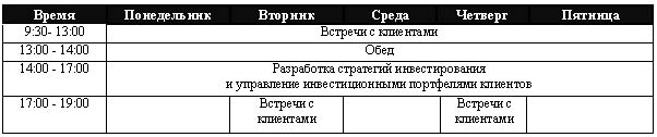 Я предложила ей ежедневно выделять особое время для встреч с клиентами и специальное время для разработки для них инвестиционных планов. Поскольку клиенты обычно назначали встречи утром или в конце рабочего дня, Миранда, уважая их предпочтения, резервировала для встреч время каждое утро и дважды в неделю — вечернее время. Кроме этого, она ежедневно оставляла три часа после обеда для составления инвестиционных портфелей своих клиентов и для управления ими.